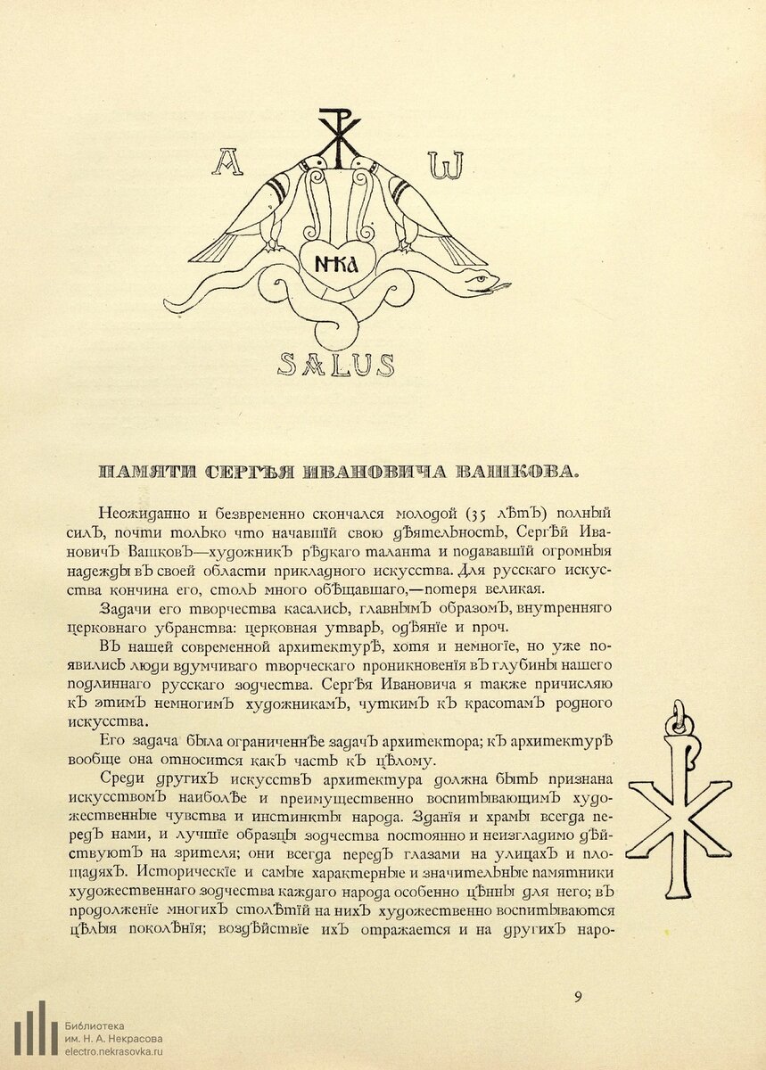 Статья В.Васнецова памяти Сергея Ивановича Вашкова, Журнал Светильник номер 10, 1914 год. Неожиданно и безвременно скончался молодой (35 лет), полный сил, почти только начавший свою деятельность, Сергей Иванович Вашков – художник редкого таланта и подававший огромные надежды в своей области прикладного искусства. Для русского искусства, кончина его, столь много обещавшего - потеря великая. Задачи его творчества касались, главным образом, внутреннего церковного убранства: церковная утварь, одеяния и проч. В нашей современной архитектуре, хотя и немногие, но уже появились люди вдумчивого творческого проникновения в глубины нашего подлинного русского зодчества. Сергея Ивановича я также причисляю к этим немногим художникам, чутким к красотам родного искусства. Его задача была ограничение задачи архитектора: к архитектуре вообще она относится как часть к целому. Среди других искусств архитектура должна быть признана искусством наиболее и преимущественно воспитывающим художественные ч