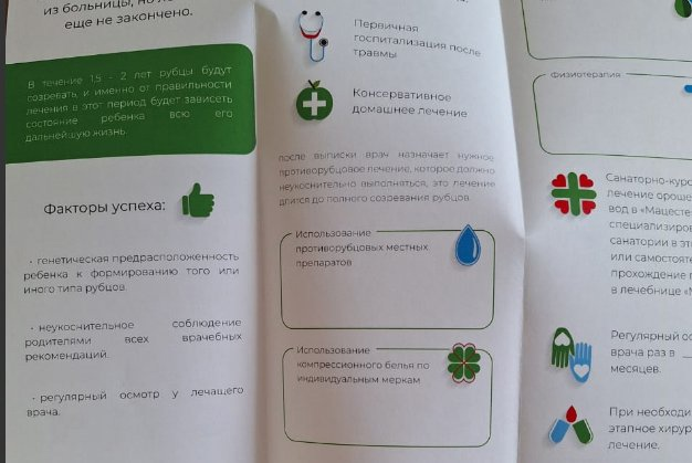 Дорогие врачи! Мы рады будем вам предоставить уже напечатанные буклеты, где вы можете дать свои рекомендации выздоравливающим ожоговым пациентам в дополнение к эпикризу. Здесь, на бумаге, вы сможете расписать более подробно какой-то вид лечения, акцентировать внимание родителей на неукоснительном соблюдении режима и назначений.