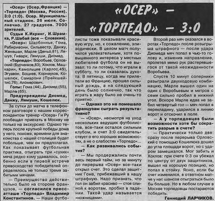 «Осер» (Осер, Франция) - «Торпедо-Лужники» - 3:0 (1:0)