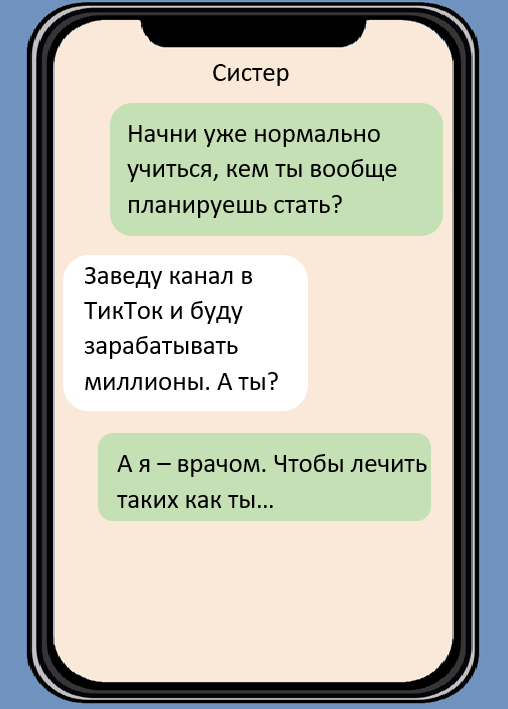 Братья и сестры - это не только бесконечные споры и драки за пульт от телевизора, но и неисчерпаемый источник юмора. Смешные переписки, нелепые ситуации, их общение во все времена было наполнено курьезами и иронией. Я подготовил несколько смешных жизненных переписок между братьями и сестрами, чтобы Вы могли расслабиться и, уверен, увидеть в них что-то знакомое. Надеюсь, это заставит улыбнуться каждого из Вас. Ситуация 1: "Кем ты хочешь стать?" Есть ли у тебя есть брат или сестра - значит у вас точно есть прозвище, а возможно даже и не одно... Ситуация 2: "Рядовая просьба" Когда речь заходит об уборки, то тут каждый сам за себя. И комната автоматически делится пополам! Ситуация 3: "Уборка в комнате" Смекалка - она такая, она либо есть, либо её нет Ситуация 4: "Морская свинка" Столько шуток про мужские носки, но без актуальность эта тема пока не теряет... Ситуация 5: "Сюрприз" Взаимопомощь и забота, без них в семье никуда :) Ситуация 6: "А как же утюг?" Знакома ли Вам хотя бы одна из с