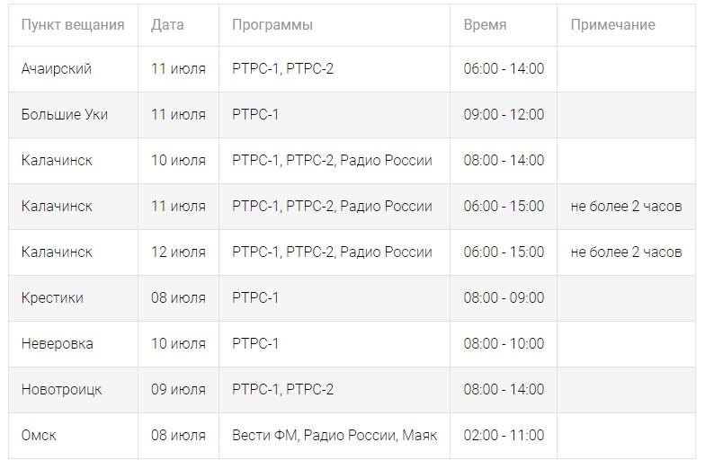 Омичей ожидают плановые отключения телерадиосигнала. Как сообщается на сайте Цифрового эфирного телевидения, временные перебои будут наблюдаться с 8 по 14 июля. Кратковременные отключения затронут жителей Омского, Большеуковского, Калачинского, Оконешниковского и Таврического районов области, а также Омска. Ниже представлен график отключения с московским временем: В это время будут проводиться профилактические и другие плановые работы. Время работ может измениться в случае непогоды. Напомним, что к РТРС-1 и РТРС-2 (первый и второй мультиплекс) относятся следующие каналы: Первый, «Россия 1», «МАТЧ!», НТВ, Петербург – 5-й канал, «Россия К», «Россия 24», «Карусель», ОТР, «ТВ Центр», «Рен-ТВ», «Спас», СТС, «Домашний», ТВ-3, «Пятница», «Звезда», «МИР», ТНТ, «Муз ТВ». Ранее портал Om1.ru писал о прогнозе погоды на следующую неделю. По данным сервиса визуализации погодных условий Ventusky.com, на Омскую область надвигается жаркая погода. Жара обрушится на регион уже во вторник, 9 июля. В этот