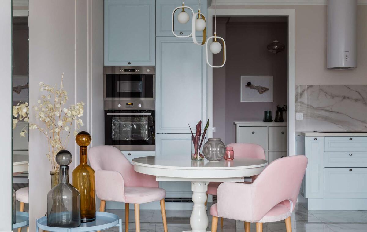 Голубые и розовые оттенки в обстановке сделали эту двушку максимально свежей, жизнерадостной и уютной