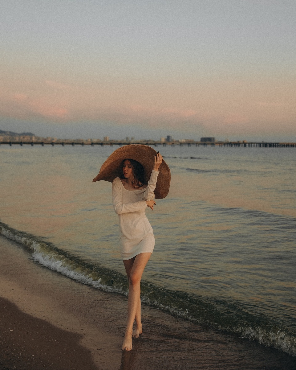 Она стоит посреди солнечного дня, и её присутствие привлекает внимание всех вокруг.