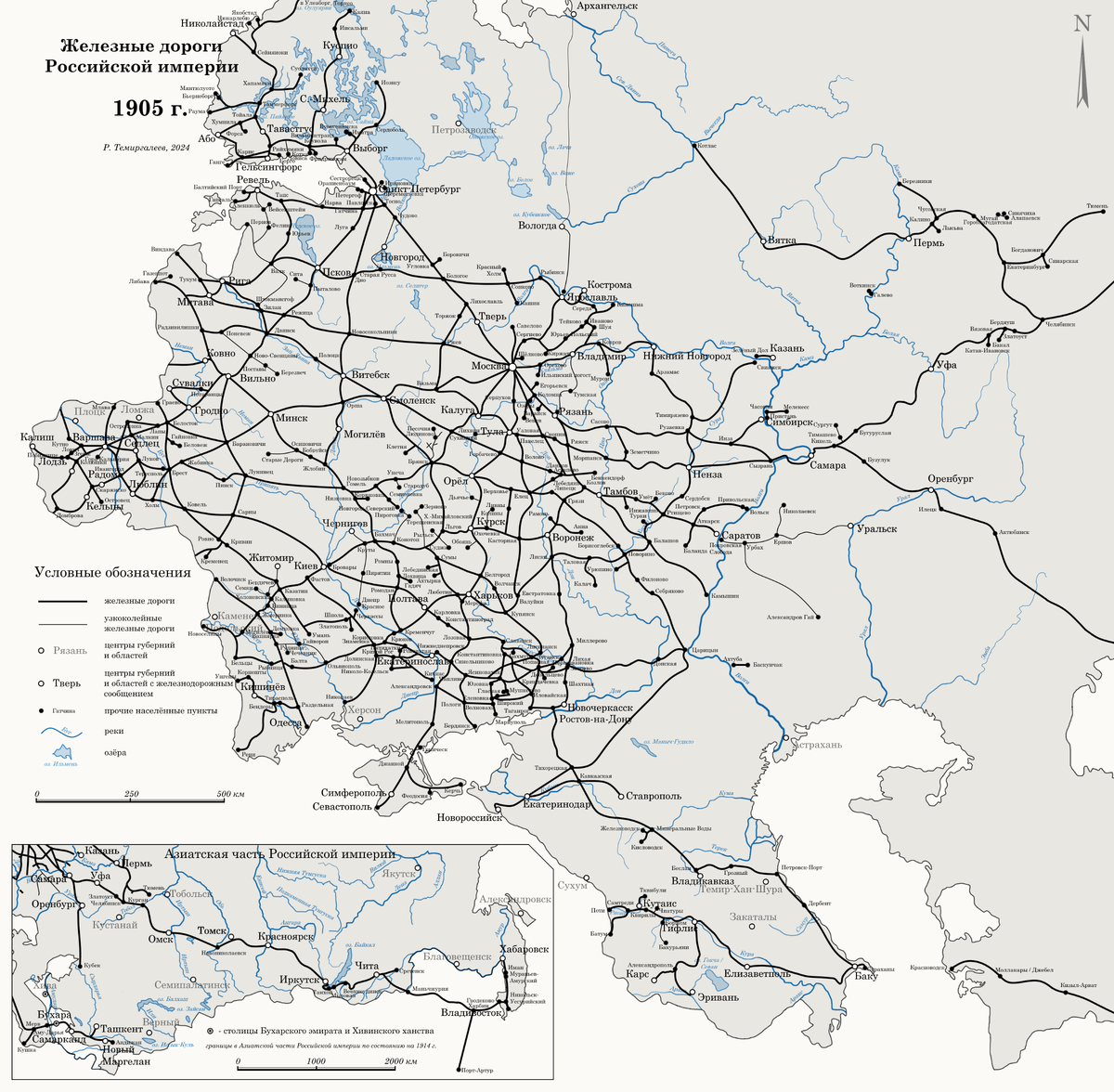 Российская империя прекратила свое существование в 1917 году, но ряд железнодорожных линий, начатых строительством в «имперский» период, продолжали строиться в течение ряда лет. В этой связи я счел целесообразным показать ввод новых линий в 1918, 1919 и 1920 годах. При этом государственные границы, названия и статус городов приводятся по состоянию на 1914 год.