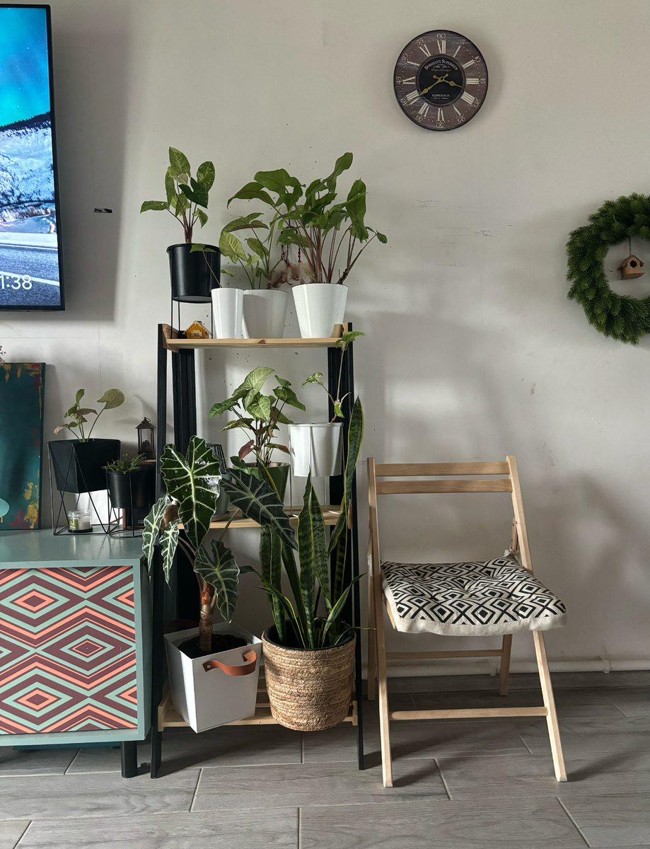 В ноябре 2023 года мы переехали в дом, и вот сейчас я подумала, а не оживить ли мне этот канал. Ведь я с нуля навожу красоту на участке, да и в доме тоже. Первым делом хочу рассказать про свои домашние растения. Здесь им стало хорошо — много места и света. Подоконники, кстати, для этих целей мне не подошли: на южных растения горят, на северных — страдают. Поэтому заказала полку на ВБ. Примерно 1200 р и все счастливы. Очень хорошо на ней чувствует себя алоказия. Мы долго не могли с ней подружиться, нижние листья засыхали, приходилось их убирать. И вот, наконец, она перестала болеть, выпустила новый шикарный лист, на который не могу нарадоваться. Сын недавно сказал: «А я думал, что когда мы переедем, то в каждом углу у нас будет стоят двухметровый щучий хвост». Не знаю, откуда он это взял, но я не против. Будем стремиться. Тем более имеющаяся у меня сансевиерия довольно быстро разрастается. Посадила два разных Синга в один горшок. Видела картинки, где они очень здорово дополняют друг др