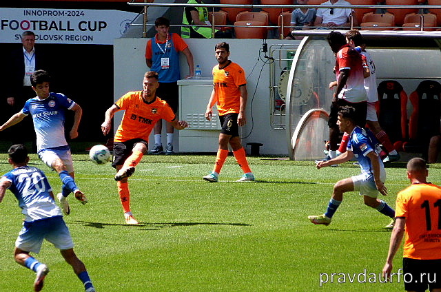 В Екатеринбурге стартовал футбольный Кубок «ИННОПРОМа». В первом полуфинальном матче «Уралу» противостоял «Равшан» из Таджикистана. Екатеринбуржцы с первых минут захватили инициативу, заставив кулябцев сосредоточиться на обороне. К прочему, уже на 5-й минуте гости понесли потерю. Алексей Ионов попал мячом в лицо Джамшеду Муродову. Того долго приводили в чувство, но в итоге заменили. «Шмели» продолжили атаковать и создавать моменты. Из выгодных позиций не смогли забить Ионов и Игорь Дмитриев. Гола пришлось ждать до 18-й минуты. Андрей Егорычев в касание замкнул передачу Алексея Каштанова. А вскоре голкипер «Равшана» Мухаммадраби Рахматуллоев выручил после очередного удара Дмитриева. Гости провели едва ли не первую серьезную атаку на исходе получаса игры. При этом сразу создали стопроцентный момент. Алексей Мамин ликвидировал выход один на один. А в ответной атаке Ионов бил в упор, и вновь потащил голкипер. Впрочем, на перерыв команды ушли при счете 2:0. В компенсированное время Каштанов