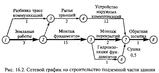 Различают работы действительные, требующие затрат времени и ресурсов, и фиктивные (ожидание), требующие только затрат времени. Например, обратную засыпку фундаментов можно выполнять, если обмазочная гидроизоляция высушена. Значит работа 6-7 на рисунке при естественной сушке является фиктивной, или ожиданием. При сушке с помощью калориферов эта работа становится действительной, так как для ее выполнения потребуется расход электроэнергии и обслуживание калориферов.