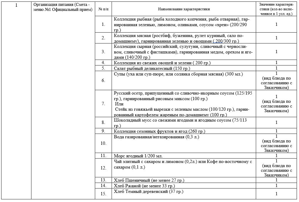 Дума Ставропольского края планирует организовать в краевой столице фуршет с впечатляющим меню. Соответствующий тендер на 600 тысяч рублей появился 3 июля на портале госзакупок. Как указано в документах, торжественное мероприятие необходимо организовать неподалеку от площади Ленина или в отдельно обговоренном месте. При этом конкретную дату заказчик не называет, речь идет лишь о периоде с момента заключения контракта до конца 2024 года. Перечень предлагаемых блюд, как обычно, весьма разнообразен. Сметы разделены на 3 части. Первая — официальный прием, и здесь гости насладятся рыбной, мясной, овощной и сырной коллекциями, рыбным салатом и русским осетром, припущенным со сливочно-икорным соусом (с альтернативой в виде говяжьего стейка с жареным картофелем по-домашнему). Запить все это великолепие можно будет водой, морсом, элитным чаем или кофе по-восточному. Фото: портал госзакупок Вторая смета — фуршет. Тут речь идет о широком ассортименте канапе, булочках, пирожках, сезонных фруктах, ш