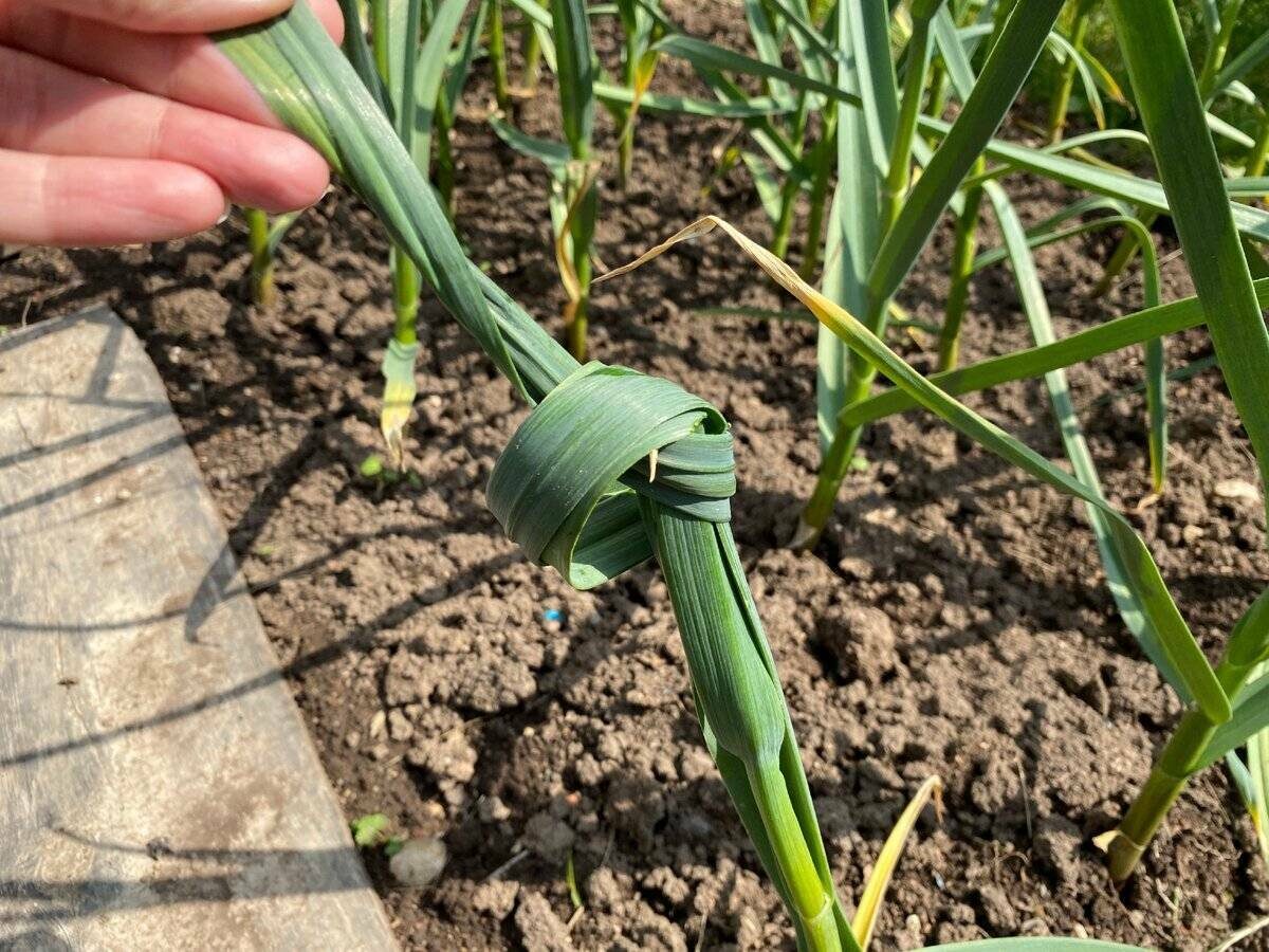 Рост листьев чеснока и формирование луковицы происходят одновременно. К середине лета начинается перераспределение питательных веществ из надземной части в луковицу. Воздействие на листья вызывает стресс для растения, что приводит к ускоренному высыханию надземной части. Привязывая листья в узел, можно ускорить процесс формирования луковицы и собирать урожай в подходящее время. Листья чеснока рекомендуется привязывать через несколько недель после обрыва цветоноса, за 7-12 дней до сбора урожая. В средней полосе это обычно проделывается в середине июля. Узел формируется из верхних листьев чеснока. При необходимости, можно завязать два узла. Важно не перетягивать узел, не тянуть за листья, чтобы не повредить надземную часть растения.