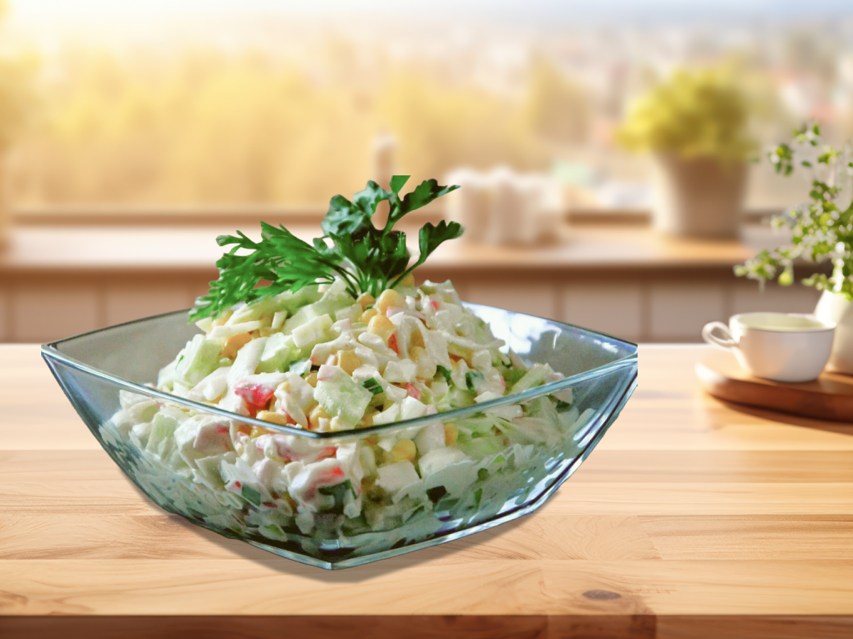 Смешать все порезанные ингредиенты, добавить нарубленный лук и укроп и кукурузу консервированную. Посолить и заправить майонезом.