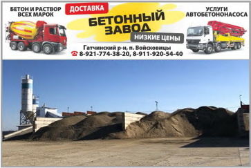 Продажа бетона оптом и в розницу от производителя по Ленинградской области. Бетонный узел находится в п. Войсковицы на территории "ЗАО ДСК-Войсковицы". Мы располагаем всеми необходимыми технологическими ресурсами и возможностями для обеспечения бесперебойных поставок бетона и гарантируем исполнение всех взятых на себя обязательств. Предлагаем: - гибкие цены и систему расчётов, - высокий профессионализм наших сотрудников, - бесплатный выезд специалиста на объект для оценки и консультации. Нашими клиентами стали: "Стройкомплекс XXI" (объект: база отдыха в Новгородской области, Валдайский район), "Трест 68" (объект: горно-обогатительный комбинат в п. Неболочи Новгородской области), АО "РЖДстрой2 (объект: п. Кикерино). Ленинградская область, Гатчинский район, п. Войсковицы