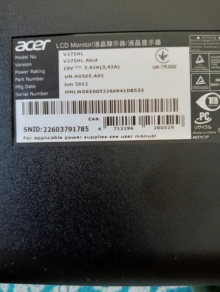 И что же вы думаете, вот так бесплатно мне достался монитор Acer v275 abid на 27 дюймов, но без ножки и блока питания, который пришлось купить за 1500 рублей.