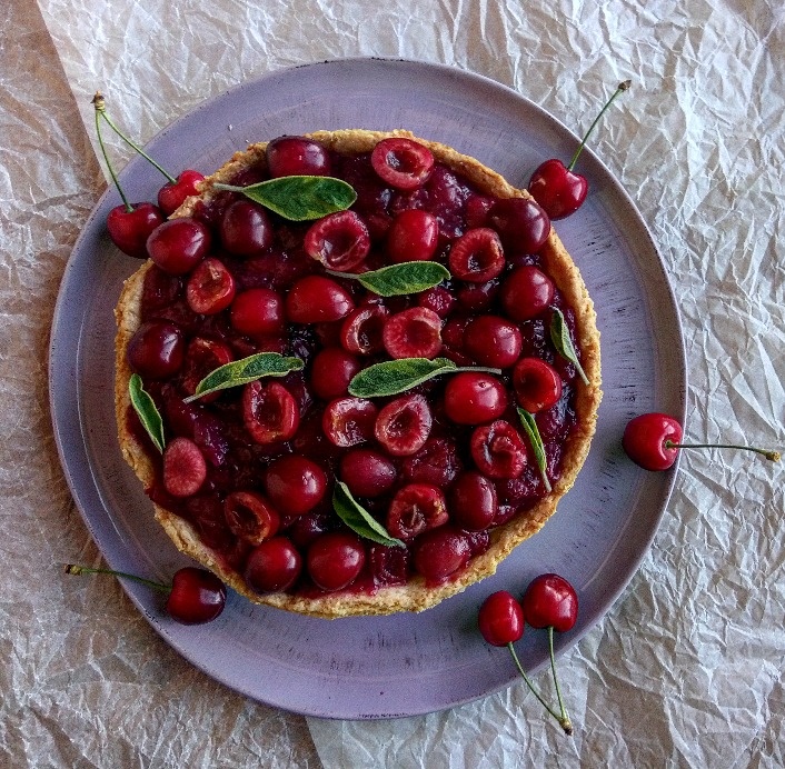 Тарт — очень популярный открытый пирог из песочного теста. Пришел он к нам из французской кухни. Разнообразие начинок дает возможность каждый раз пробовать что-то новое. Люблю побаловать своих близких вкусненьким. Сегодня я поделюсь с вами своим рецептом черешневого тарта с шалфеем и заварным кремом. Тесто: Заварной крем: Начинка: Первым делом готовим заварной крем. Поставьте 400 мл молока на огонь, добавьте ванильный сахар и обычный. В миске смешайте крахмал, желтки и 100 мл молока. Доводим молоко почти до кипения, затем аккуратно половником добавляем потихоньку в яичную смесь постоянно её помешивая венчиком, чтобы масса стала тёплой.