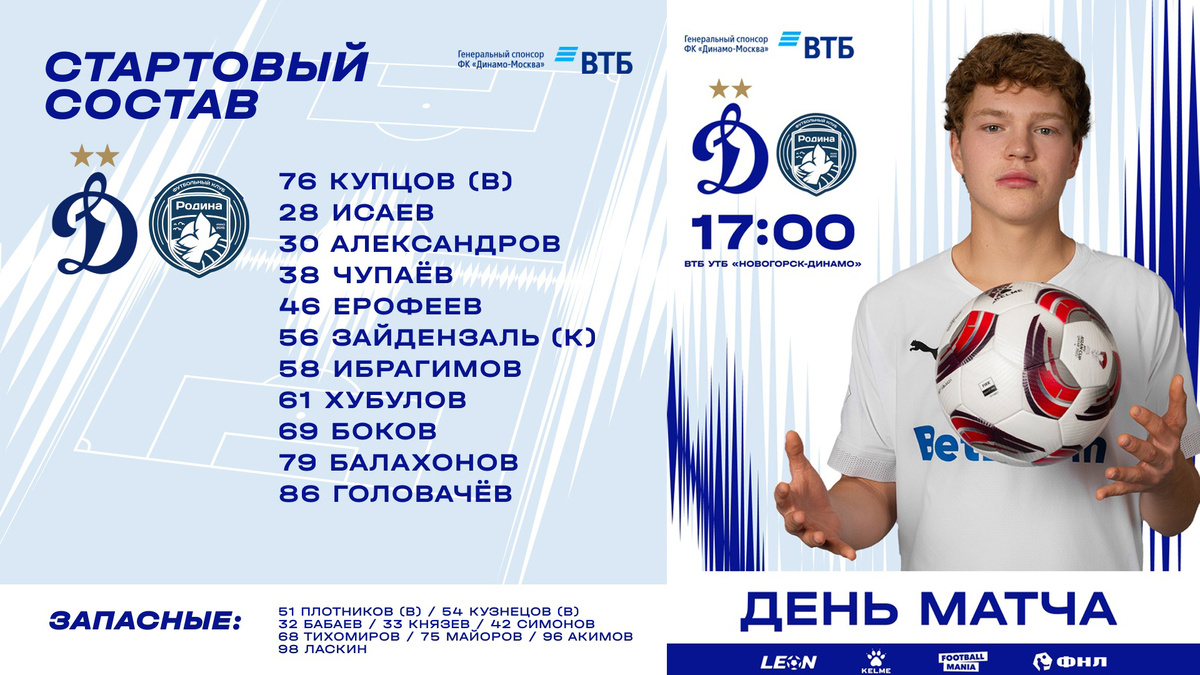 Да уж, совсем бы бестолково получилось, если бы матч с Родиной вчера не отменили! Представляете, вчера основа на матче с ОФК, значит, с Родиной играет Динамо-2, а сегодня оно же с Родиной-М! Бабаев появился в запасе, значит, от травмы потихоньку восстанавливается. Непонятно мне: Хубулов и Чупаёв выходят оба, и оба по амплуа центрфорварды. Наверное, Хубулов будет играть слева, а Денис Боков - правого вингера. Всё остальное вроде бы понятно. Вперёд, Динамо! Даёшь победу! Нельзя упускать лидерство! А мы за тебя болеем! Вот здесь: https://vk.com/video-221212132_456241118 Адрес моего основного канала: