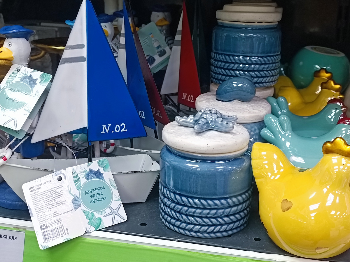 Я только вернулась из отпуска, как случилось у нас переселение в дом отца в подмосковных Озёрах. Очень уж жарко на нашей даче, папа уехал в Красноярский край, за его огородом тоже смотреть надо, вот и мы совместили приятное с полезным - перебрались в его соседний дом, в прохладу. Жара ж Подмосковье вернулась строго, как я и просила😆 И конечно мне надо его не то, чтоб обуютить, хотя бы купить самое необходимое для комфортного жилья. А у меня представление о нём особое🤣 Чтоб всё под рукой и красивое! Помните, как я и на море быстренько обустроилась в съёмном жильё? 🤣 Так что метнулась я в наши озерские Фикс Прайс. Чтоб и подставку для ножей купить, и для столовых приборов, и полотенца на кухню, и тарелки - короче всё. А там столько снова прекрасного! А не необходимого -даже швабры снова нет🤣 Шкатулочки в морской тематике. А мне б сахарницу на килло! Рядом жестяные кораблики. Мне надо! Но сначало мне швабру нать! 😆 Тарелочки для мелочей - может под орешки купить? Раз уж подставо