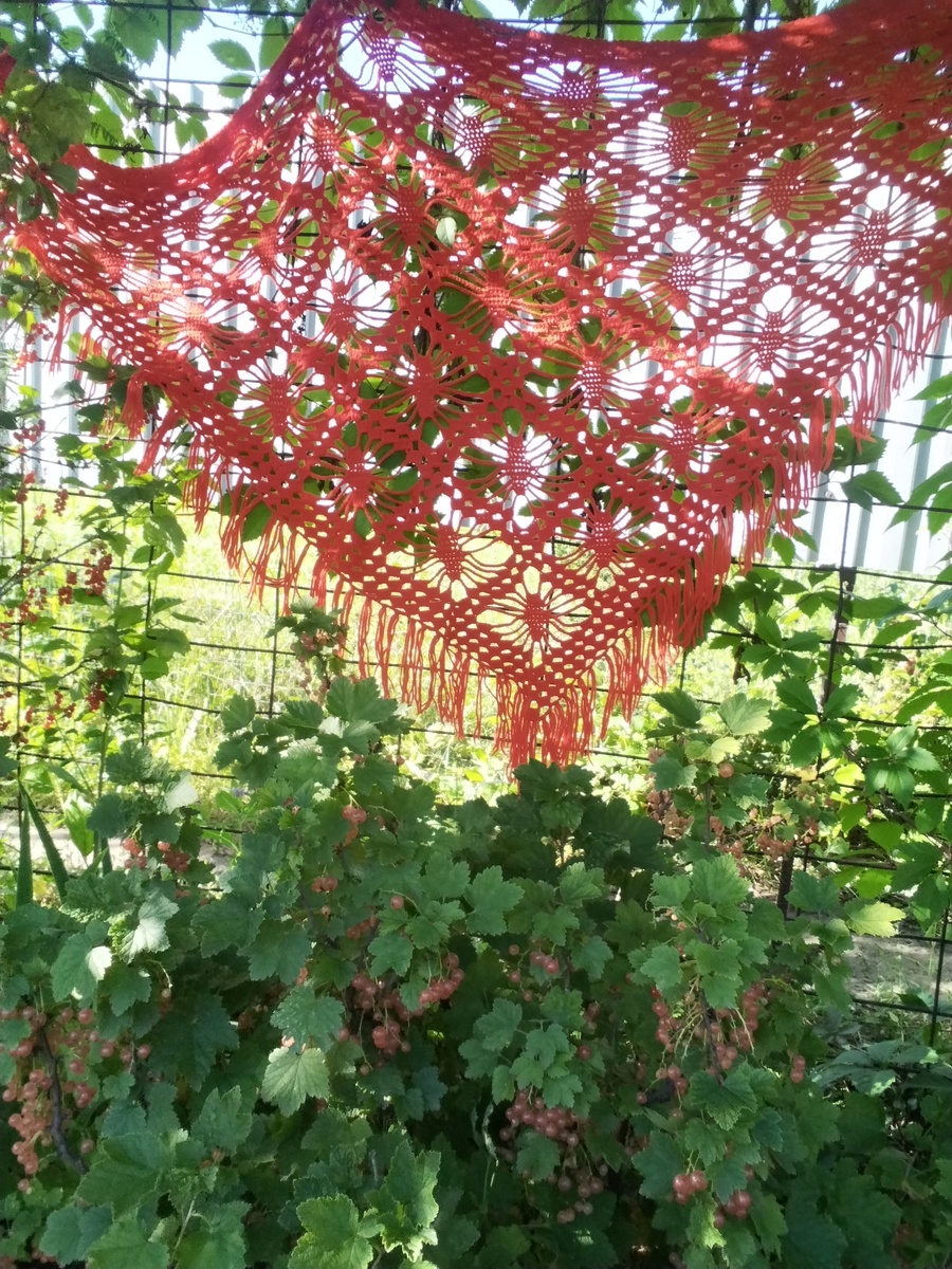 Пятнадцать лет тому назад, еще живя в Израиле, задумала я связать шаль. Дело было в октябре, близилась зима, а зима там мерзкая и числа 6-7 ноября я начала эту шаль. Но 9 ноября в пять часов вечера раздался звонок от папы из России, умерла мама... На каком автомате я сунула эту "везенку" (так моя бабушка называла любое вязаное изделие, находящееся в процессе) в сумку, не помню. Не помню, как летели до Москвы, как на поезде ехали до Тамбова. Сплошной туман в голове... Пока были в Тамбове я вязала эту шаль. Абсолютно бездумно, на каком-то автомате. Я даже не помню, как я ее закончила. И забыла взять с собой. Так она в Тамбове и осталась. А через год, я обнаружила ее, аккуратно сложенную в мамином шкафу. Уже много лет эта красная шаль живет у нас на даче. Я все время удивляюсь, почему в ней тепло, она же вся из дырок? И тем не менее она прекрасно защищает от холода и от комаров. Каждый раз я, накидывая на себя эту шаль, вспоминаю маму. Не иначе ее тепло и любовь воплотились в этой ш