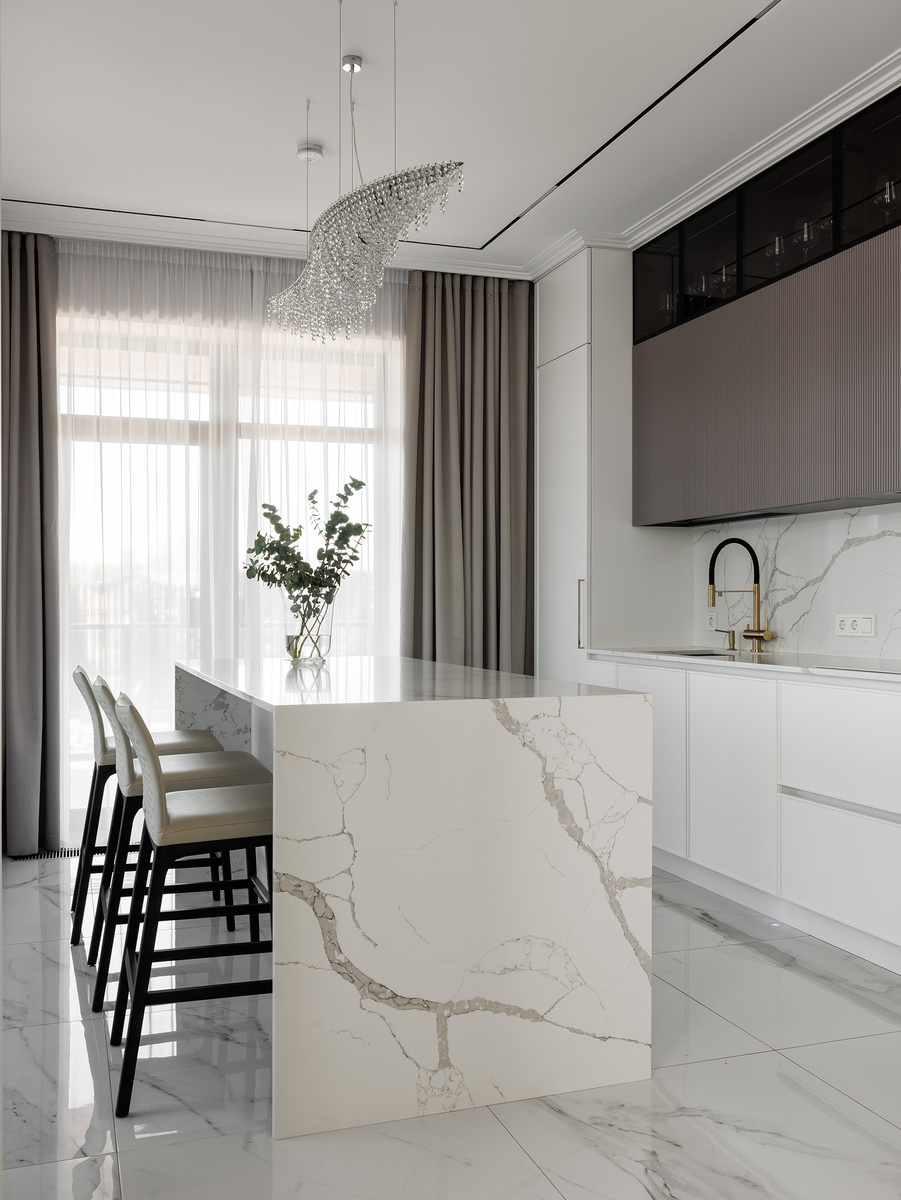 Данную кухню с островом мы выполнили на заказ по проекту дизайнера интерьера загородного дома. Центральное место в помещении кухни занимает остров в отделке кварцевым агломератом с мраморным эффектом. Его монолитная конструкция и гладкая поверхность создают ощущение роскоши и безупречного стиля. При этом он служит не только функциональной зоной для приготовления пищи, но и стильным акцентом, объединяющим все элементы интерьера. Высокие стулья с мягкой обивкой, расположенные у острова, обеспечивают комфорт и создают уютную атмосферу для общения за обедом или чашкой кофе. Кухонные модули выполнены в светлых оттенках с использованием гладких фасадов и современной фурнитуры, что подчёркивает минималистичность и чистоту линий. Верхние витринные модули с подсветкой, что придаёт интерьеру дополнительный объём и лёгкость, а также позволяет красиво демонстрировать красивую посуду и аксессуары.