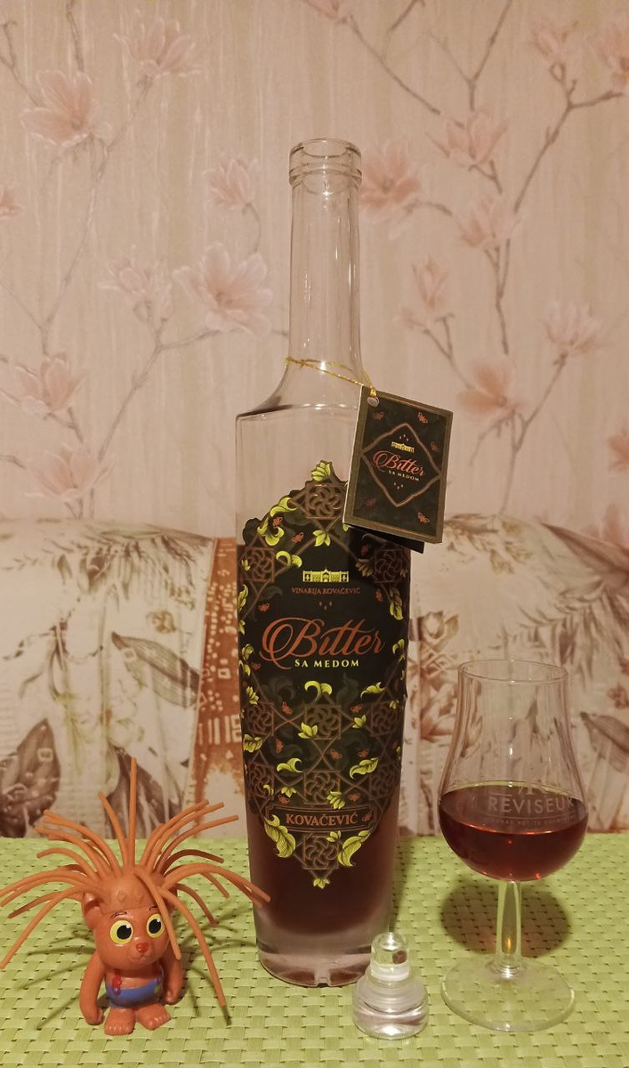 Продолжаем знакомиться с разными напитками 😁. Очередной обзор от моего друга Alex Sobolev (текст автора; образец и фото предоставлены Сергеем Измалковым). Герой сегодняшнего обзора - Bitter Sa Medom Kovacevic. Ни в коем случае мои отзывы не претендуют на безапелляционную объективность. Это только мое личное мнение о конкретном напитке, а оценка выражает только мое отношение к нему. Ликёр Bitter Sa Medom Kovacevic 32%. Сахар 133 г/дм³. Этот великолепный напиток обладает золотисто-медовым цветом, благоухающим ароматом трав и сладким вкусом с оттенками меда, пряностей и легкой горчинкой в послевкусии. Изготовлен с использованием тщательно отобранных трав и меда. Конечно же биттер неправильно сравнивать с водками, так что я просто опишу его и оценю на свой вкус, сам по себе. Аромат конечно же завораживает медовыми травами и пряностями. Пряности пожалуй даже больше доминируют. Доминирующей же в аромате в целом, пожалуй, является вишня. Великолепно солируют корица, мускат и кардамон. Хорош