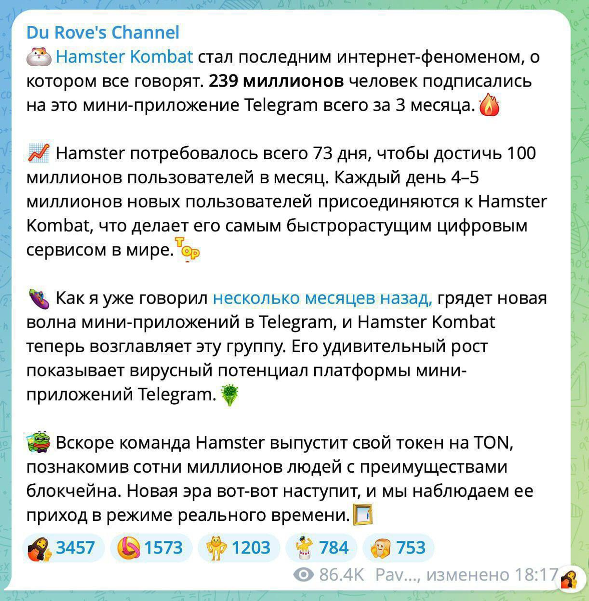 Если вы долго играли в хомячка то для вас у нас хорошая новость , Павел Дуров анонсировал аирдроп и многомиллионное комьюнити а именно ~238млн Мы предоставим вам возможность осуществить вывод монет в настоящие деньги. Также будет действовать акция на вывод , если вы позовете своего друга то 15% от пополнения будут ваши ! если в дальнейших выводах нам будут писать люди что вы от Ивана Иванова , то вы получите суммарно 30% от всех выводов вашего имени ! Ссылка на канал https://t.me/humstercb Так же есть саппорт который ответит на любые вопросы, в самые краткие сроки