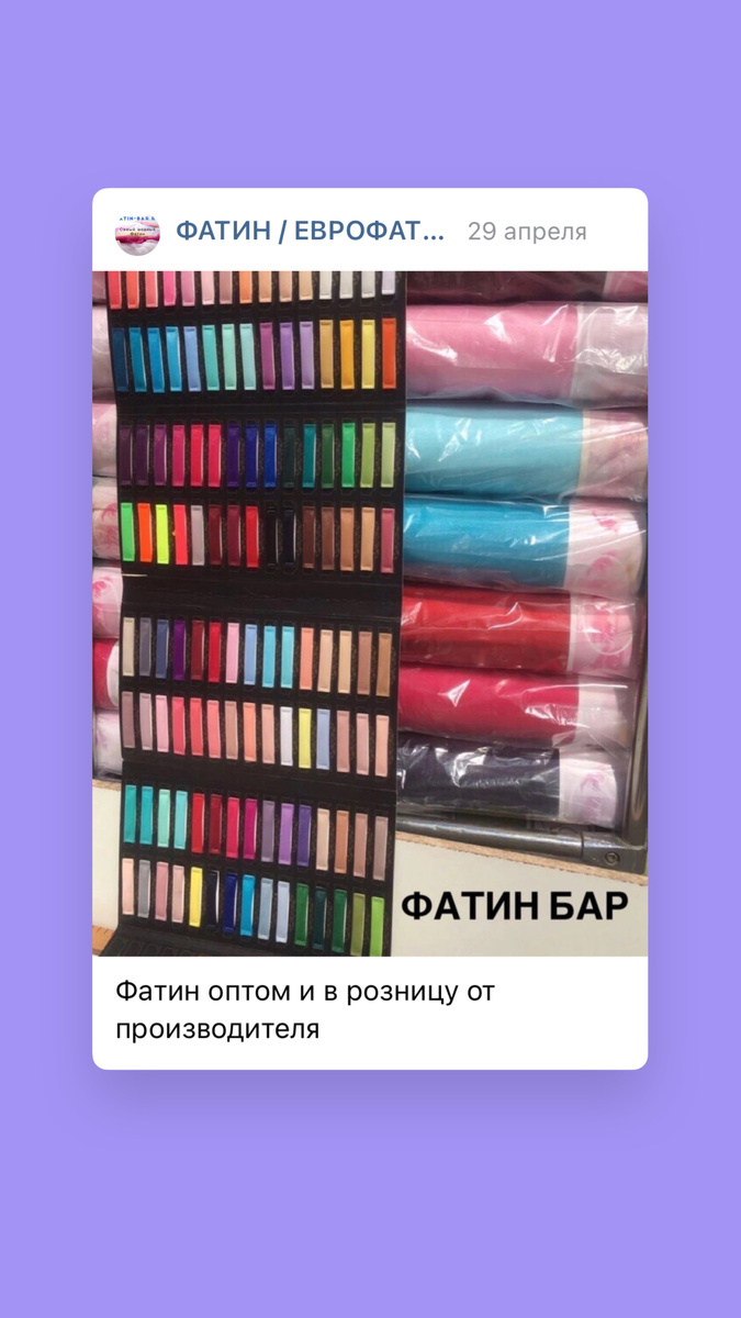 Где купить фатин в Москве? Волшебный мир "Фатин Бар" ждет вас! Планируете пышную юбку-пачку, воздушную фату или сказочный декор? Тогда вам не обойтись без фатина! И если вы ищете, где купить фатин в Москве оптом и в розницу, да еще и в головокружительном ассортименте, то "Фатин Бар" – ваш верный ориентир. Забудьте о долгих поисках! "Фатин Бар" – **единственный официальный представитель турецкой фабрики фатина в Москве и России**. Мы находимся в самом сердце текстильного мира – ТК "Садовод", и готовы предложить вам: * **Феерию оттенков:** более 300 цветов фатина от нежных пастельных до ярких неоновых – ваш творческий потенциал не будет знать границ! Разнообразие фактур: еврофатин, фатин средней жесткости, жесткая сетка – у нас найдется материал для любого проекта. *Все для творчества в одном месте:** помимо фатина, в "Фатин Бар" вы найдете атласы, хлопок различных видов, атласные ленты и многое другое. Гибкие условия: мы работаем как с оптовыми, так и с розничными покупателями, пр