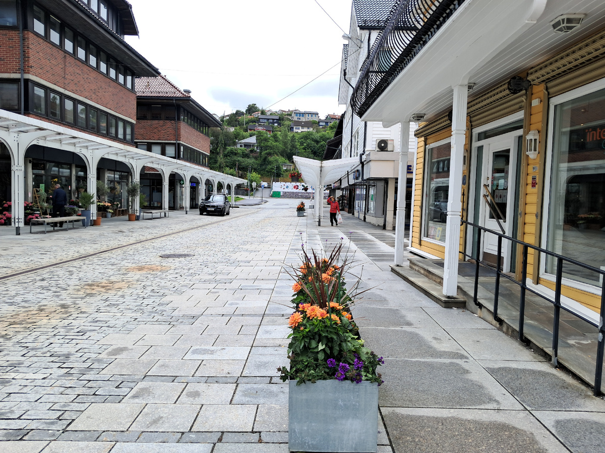 Иногда и я удивляюсь малолюдности улиц нашей норвежской деревни. Хотя привыкла к этому. Вот суббота сегодня. Магазины до вечера открыты. Но нет людей на улице. Разве что на автобусной остановке парочку человек, сидящих на скамейке, увидишь. Хотя красотой есть кому заниматься. Хочу показать нашу деревенские центральную улицу во всей её июльский красе. Это территория перед магазином под названием Интер Флора. Магазин на выходные уже закрыт. Но цветы на ночь и на выходные сотрудники его не убирают. Любуйся красотой любой желающий. Очень мне нравится такое нестандартное оформление старой телеги. Мило выглядит. Кашпо с сердечком тоже не оставят равнодушным. Каждый магазинчик(бутикк по-норвежски), кафе или аптека тоже свой вклад в уличную флористику вносят. Вазоны с цветами у каждой двери такого заведения. Места отдыха на берегу бухты. Ограничитель движения-тоже "цветочный." Любуюсь клумбой перед мэрией. Шикарны летние георгины. Буду рада, если вам