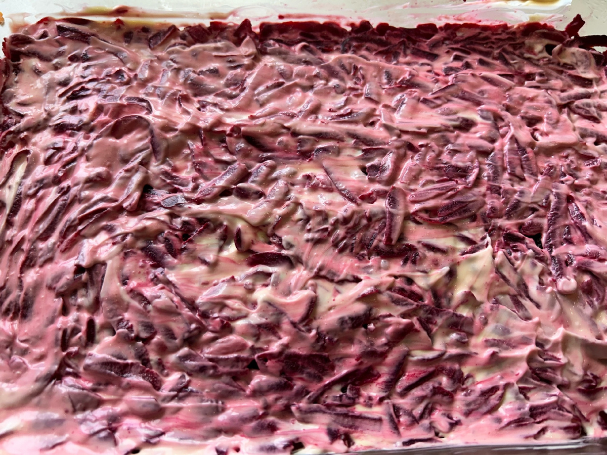 В классическом рецепте салата «Селёдка под шубой» первым слоем идёт сельдь, вторым — варёный картофель, третьим — варёная морковь, четвёртым — варёные яйца, пятым — свежая варёная свёкла, шестым — майонез. Но я делаю ее по своему.
