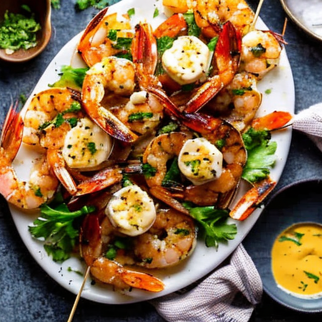 Креветки с копчёным сыром на гриле и сливочно-горчичном соусе.