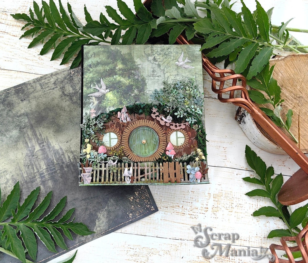 Добрый день, с вами Рамзиля и мой гновый альбом. "Жил-был в норе под землей хоббит... Нора была хоббичья, а значит благоустроенная. Она начиналось идеально круглой, как иллюминатор, дверью, выкрашенной зеленой краской дверью, с сияющей медной ручкой точно по середине"- так начинается знакомство с домом Бильбо Бэггинса на первой странице "Хоббита", в краю Шир, где так же обитают и другие хоббиты -веселый и беззаботный народ фермеров-полуросликов.." Так же и начинается мой альбом, а вернее - его обложка с домиком хоббита. Как вы уже поняли, работала я с коллекцией "Легенды Средиземья", с загадочными и завораживающими принтами и иллюстрациями. Размер альбома 23х20см, в нем 3 разворота. На каждлм развороте размещены рамки для фото, сделанные ножом "Бамбуковая рамка". В них я поместила персонажей с листа с картинками "Легенды Средиземья.Маги и хоббиты" Дом Хоббита подземное жилище, защищен земляным слоем...(Объемное жилище из воздушного пластилина и покрыла сухим мхом). Дверь в дом имеет к