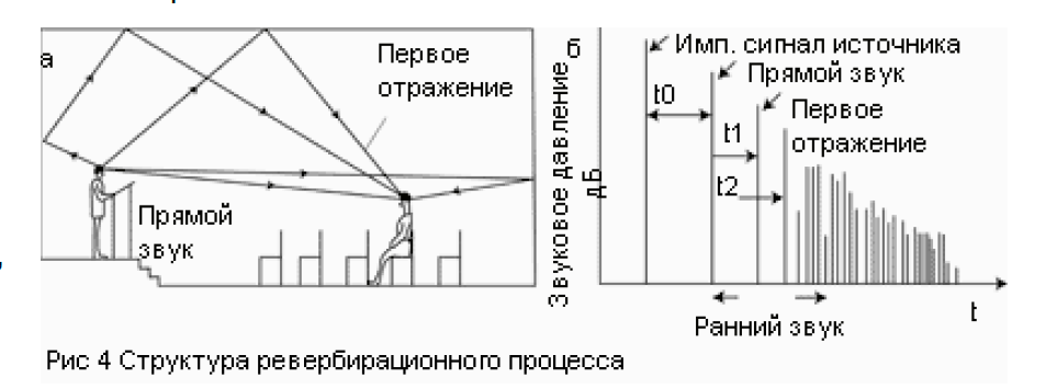 Как видно из рисунка, в начальный момент при использовании в качестве источника, например, короткого импульсного сигнала, к слушателю поступает прямой звук, затем, через определенное время, начинают поступать отражения от различных поверхностей, которые сначала четко разделены друг от друга по времени, затем количество их увеличивается, звуковое поле становится диффузным, и уровень звукового давления в данной точке помещения постепенно спадает - такой процесс спада звука в помещении и называется реверберационным.