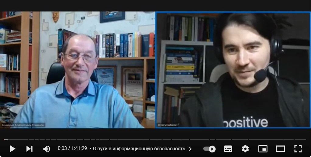 Не так давно известный блогер Дмитрий Фёдоров предложил мне высказать своё мнение по ряду вопросов, как непосредственно связанных с проблемой образования в сфере кибербезопасности, так и связанных опосредованно, неявно. Вместо запланированного часа беседа (по большей части монолог) длилась аж 1:41:29: https://vk.com/video/@cybersecurity_roadmap?z=video-43111814_456239050%2Fclub43111814 Иначе, как мне представляется, и быть не могло, потому что в общей сложности Дмитрий задал мне десять вопросов, на которые совсем уж коротко ответить было просто невозможно. Я и так старался не растекаться мыслью по древу. А вопросы касались и моего пути в информационной безопасности, и безопасности, и философии, и даже формулы счастья (которую я вывел более 40 лет назад), и много чего ещё. Думаю, скучно не будет, но при этом будет интересно и, надеюсь, полезно.