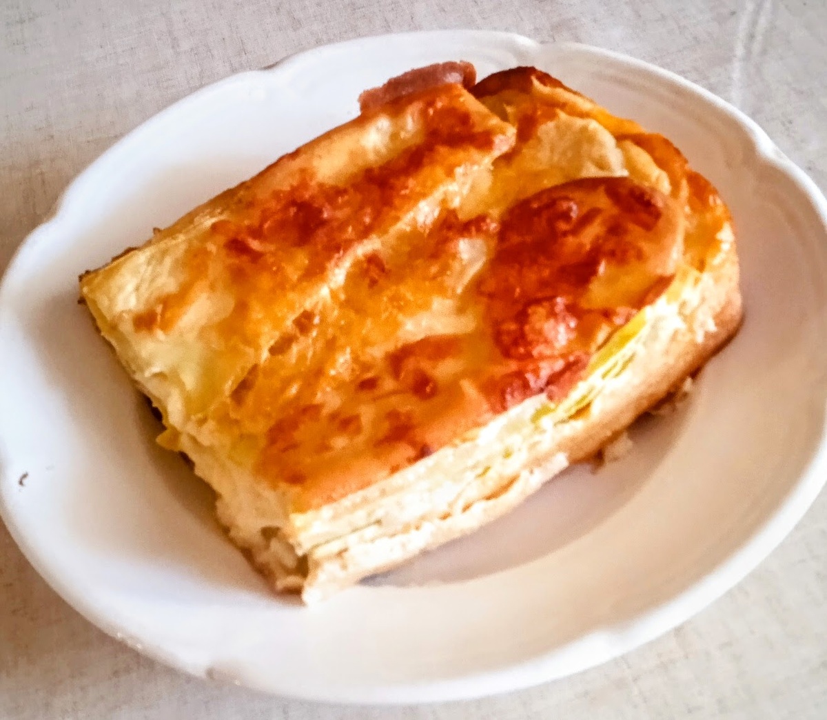 Каждый слой промазывается блинным тестом (как на всякоблин, любой вариант) и присыпается тонким слоем натертого сыра.