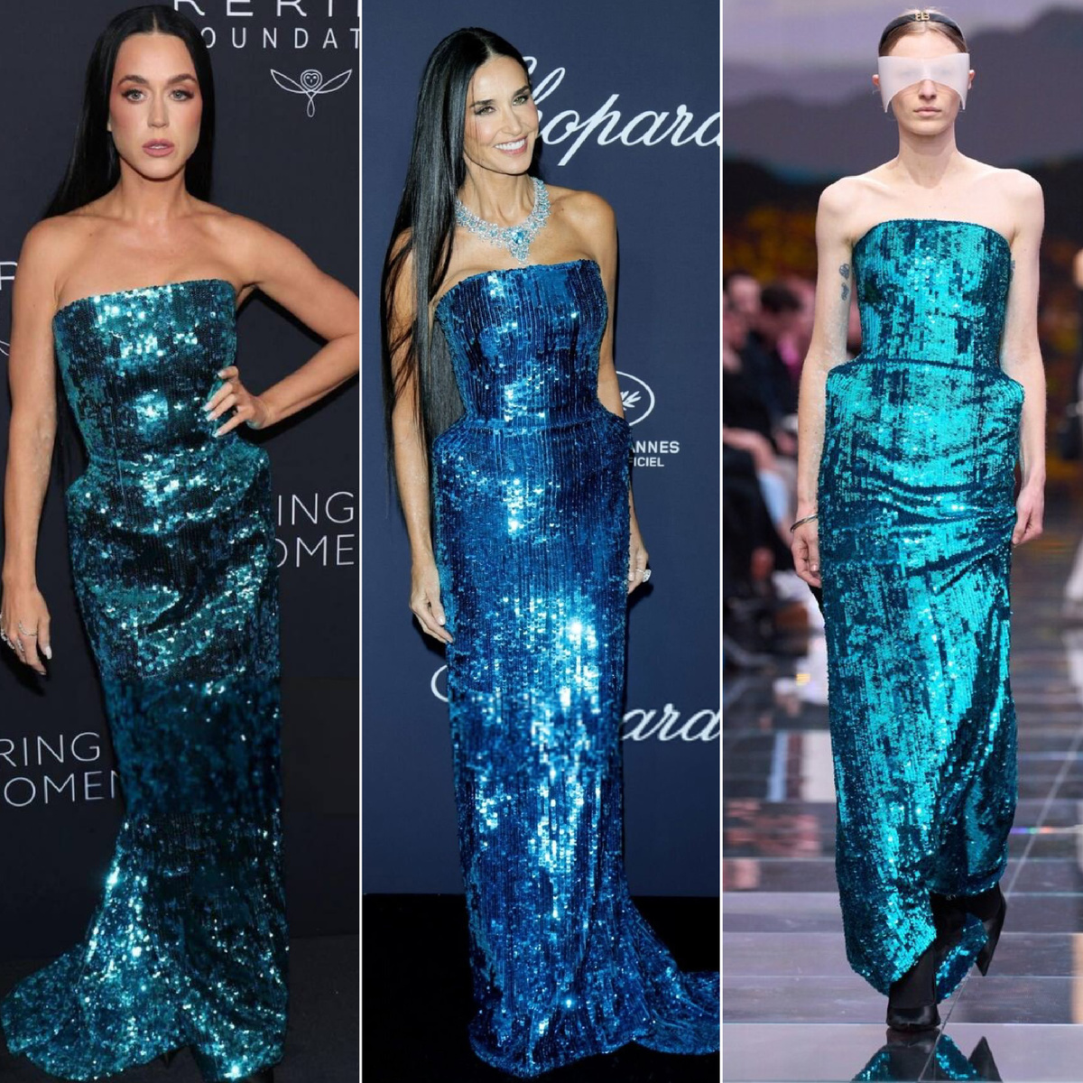 Кэти Перри полностью повторила подиумный образ, а Деми Мур добавила роскоши в виде ожерелья. Мой голос за неё.
