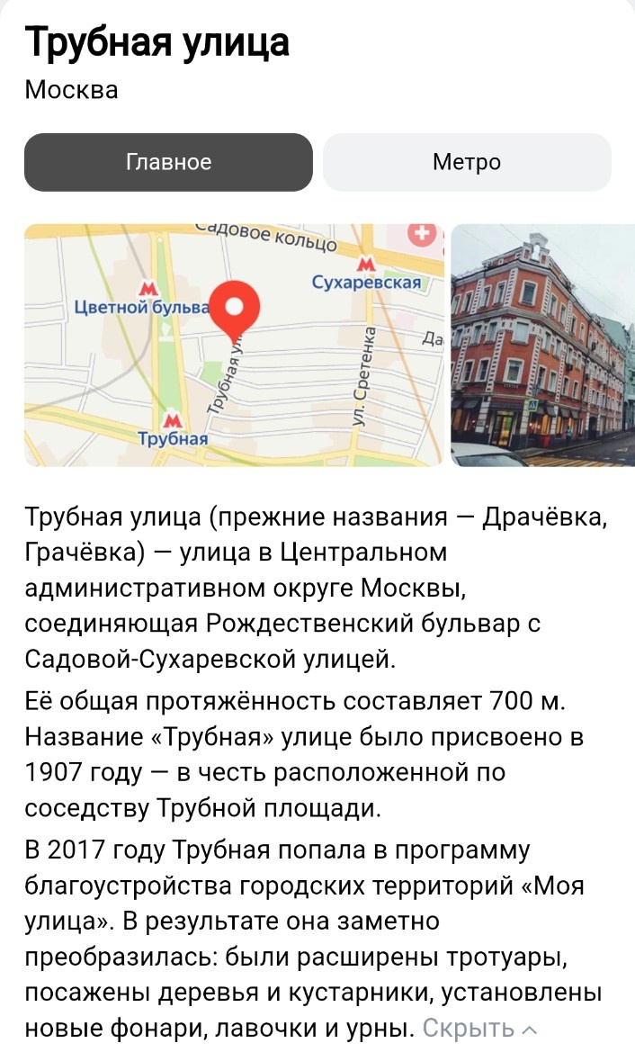 Давно обещала рассказать про этот удивительный уголок Москвы. Казалось бы - ну, улица, ну, Трубная и что? А вот что 🤗. Улочка длиной в 700 м. Честно говоря, я не помню,какой она была до 2017 года, то есть до проекта "Моя улица", но сейчас она прекрасна 😍. Разве можно подумать, что это центр Москвы? Ещё сложнее поверить, что ещё совсем недавно (относительно , конечно), эта и примыкающие улочки были одним из самых страшных мест Москвы - похлеще Хитровки, которую так любил описывать Гиляровский. Здесь он, кстати, тоже бывал-с. Рассказывают, как по этой самой трубе отправляли в "дальнее плавание" ненужных и лишних... Публичные дома Грачёвки славились на всю Москву. Короче говоря, жуткое было местечко 🤷🏻♀️. Зато сейчас - любо дорого посмотреть: В прошлый раз, когда гуляла по Трубной, не поняла, почему тут Чехов: После того, как поискала информацию в Википедии - стало понятно 😊. Смотрите, какие тут дворики: А двери: У кого-то базилик в горшках во дворике растёт: Несмотря