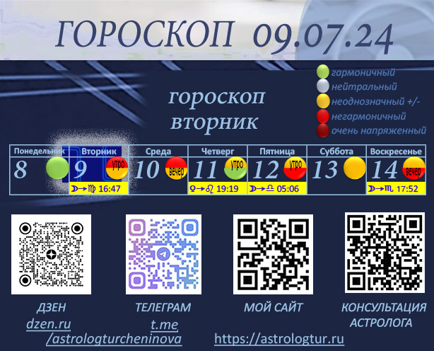 С 5 до 11 утра (мск) - возможны непредвиденные, неожиданные обстоятельства, неблагоприятные известия. В это время может появиться раздражительность, эмоциональный фон неустойчив, каким-то фразам, действиям можно придать совершенно не тот смысл, который в них был первоначально заложен. В этот период лучше повременить с идеями, предложениями, изменениями. В течение дня, особенно с 13 до 22 часов (мск) - может происходить возврат ситуаций, событий, встречаться знакомые ранее люди. В это время появляется возможность исправить прошлые ошибки, или на примере прошлых ошибок не допустить новые. Благодаря рациональному мышлению, которое станет нам союзником ≈ с 17 часов (мск), будет намного проще со всем разобраться, возможно что-то придется отправить на доработку. Позитивчик дня: Продолжает своё влияние гармоничный аспект Венера-Уран, и к нему присоединяется влияние гармоничного аспекта Венера-Нептун, подробнее о них можно прочитать в Гороскопе на неделю с 8 по 14 июля 2024 Фейерверк чувств