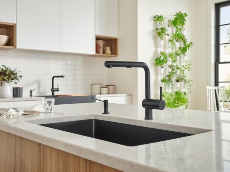 - Монохромные детали: Белая кухня в сочетании с черными или темно-серыми элементами — классическое решение для создания современного и стильного пространства. Это могут быть черные стулья, светильники или ручки шкафов, которые добавляют изюминку и контраст.