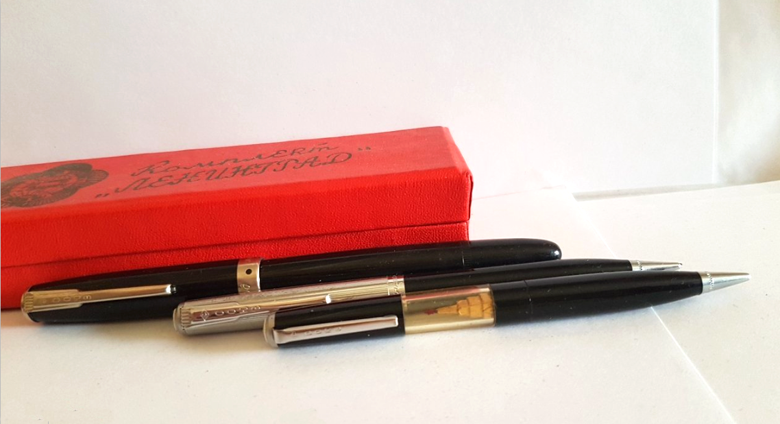 Ассортимент этого завода во все времена был очень разнообразным: там производили канцелярские перья, кнопки, готовальни, автоматические карандаши и авторучки, небольшие фирменные наборы канцпринадлежностей, в том числе - и подарочные. Например, набор "Золотая рыбка" - очень оригинальное подарочное решение.