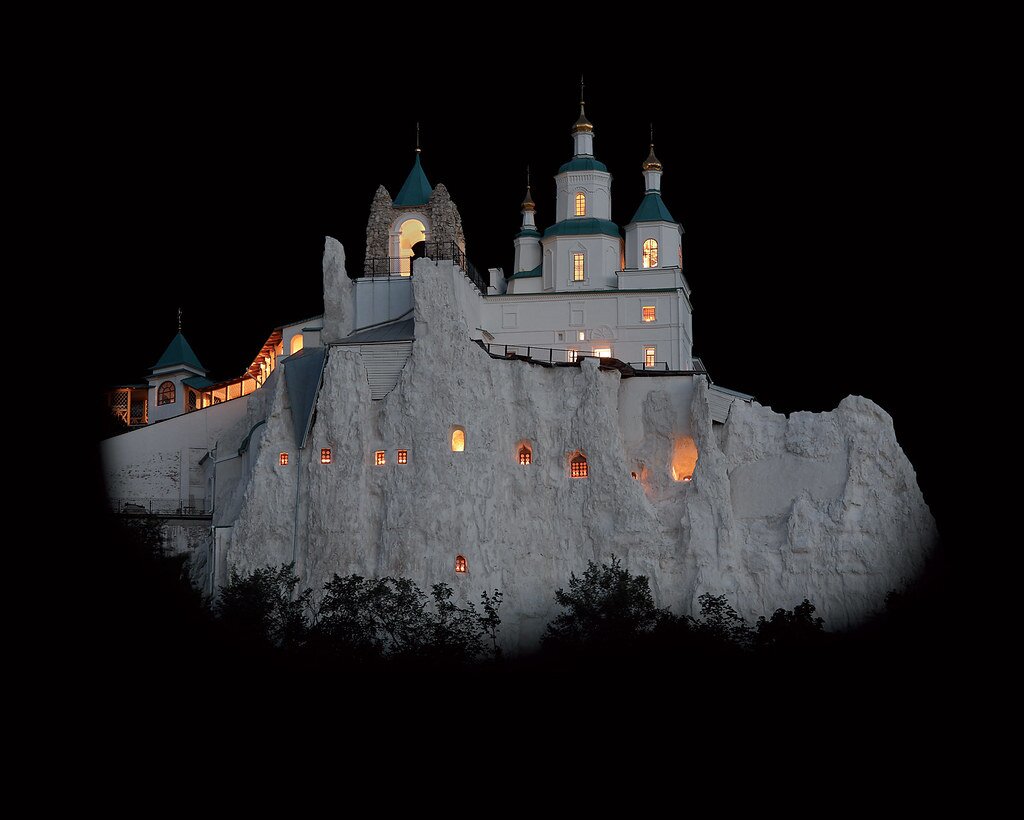 В древности это был монастырь-крепость, неприступность которого обеспечивалась фортификационными характеристиками самой скалы. В XVII в. обитель представляла собой пятиярусный комплекс пещерных помещений, размещённых друг над другом на высоту 50 м в самой скале и в нескольких малых утёсах, на которые разделялась скала в верхней части. Общий вход (выход) в монастырь был сделан у подножья меловой горы в её восточной части. Далее по склону проложена была лестница к реке, где находилась пристань обители, а с конца 1670-х гг. — небольшой комплекс деревянных сооружений с Петропавловской церковью. Такой вид монастыря зафиксирован на графическом изображении обители, поданном архимандритом Иоилем (Озерянским) в феврале 1679 г. в Разрядный приказ Московского государства для подтверждения прав на монастырские земельные владения.