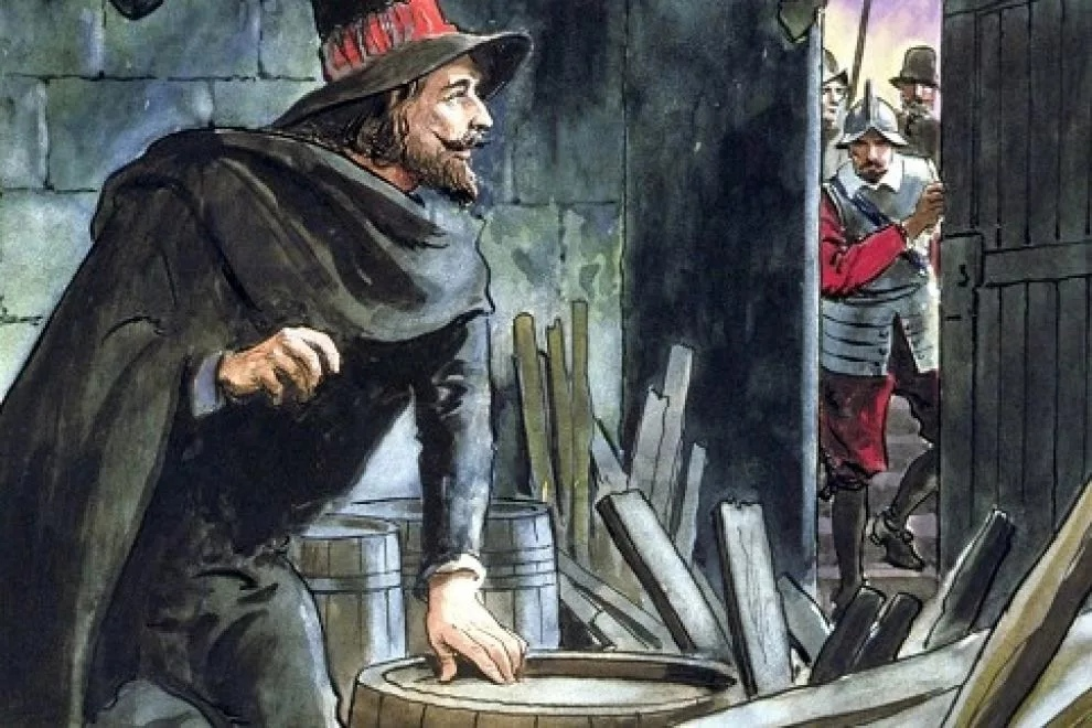В Англии некий дворянин вроде бы из Йорка (но это не точно) Гай Фокс (Гвидо Фоукес) чуть было не взорвал 35 бочонков с порохом, которые складировал аккурат под парламентом, где в ночь с 4 на 5 ноября должен был выступить король Яков I. Если бы пороховой заговор удался, то погиб бы и сам король и весь парламент, большинство в котором составляли не католики, а английские протестанты. Заговор готовили как раз католики по большей части из Йорка. До этого в 1604 году король Яков казнил многих католиков и пороховой заговор - это вроде бы как месть. Но Гвидо для заговорщиков был скорее наёмным специалистом. Сам Гвидо профессиональный военный, долго служил за границей и там обучился взрывному делу. После поджога пороха, должен был на лодке переплыть Темзу, а потом и вовсе добраться до моря и покинуть страну.
