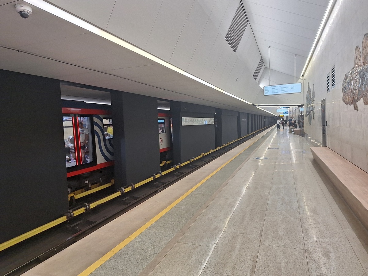 Вид станции необычен из за этих огромных, реалистичных рыб, выполненных в мозаичном панно. Использован натуральный камень.