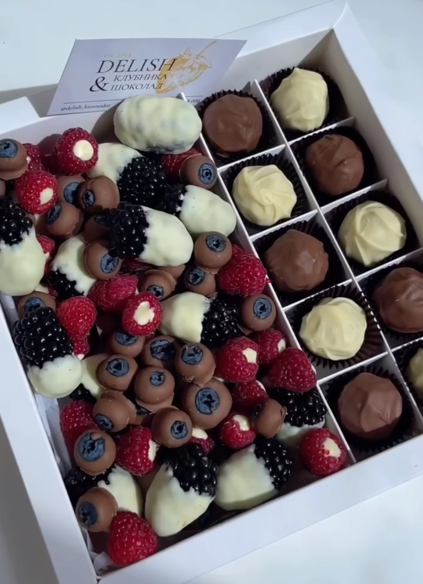 Представьте себе сочные ягоды, обволакиваемые тонким слоем шоколада. Это идеальное сочетание свежести и сладости, которое пробуждает вкусовые рецепторы и доставляет непередаваемое удовольствие. Поверьте, ваши гости не смогут устоять перед ягодно-шоколадным наслаждением! Свежие сочные ягоды - это не только вкусно, но и полезно. В них мало калорий, много клетчатки, антиоксидантов и микроэлементов. Клубника- ягода с высоким содержанием витамина C, укрепляющего иммунитет и спасающего от вирусов. Ежевика- настоящая кладезь антоцианов. Вещества в составе ягоды обладают противовоспалительными свойствами и помогают улучшить зрение. Кроме этого ежевика содержит калий, что положительно влияет на кровяное давление и общее самочувствие человека. Малина сочетает в себе пользу витаминов С, Е и К, а также железа. Фолиевая кислота (вещество, которое есть в составе малины) помогает синтезировать нейромедиаторы, ответственные за настроение, аппетит и сон. В голубике - высокое содержание витаминов С и К