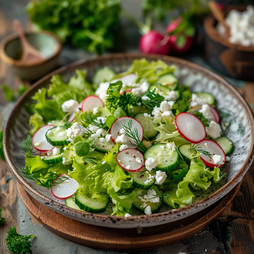 Сегодня свежий и лёгкий рецепт — салат с редисом и творогом. Он идеально подходит для летнего завтрака или лёгкого ужина. Давайте начнём! 200 г редиса 1 средний огурец 3 горсти салатных листьев 100 г рассыпчатого творога Маленький пучок зелени (укроп, петрушка) 1 столовая ложка лимонного сока 2 столовые ложки оливкового масла Соль и свежемолотый черный перец по вкусу Этот салат великолепно подходит для лёгкого и освежающего перекуса. Он прекрасно сочетается с любым основным блюдом, будь то запечённые овощи или лёгкий суп. Салат с редисом и творогом понравится всем, кто любит свежие и полезные блюда. Не забудьте попробовать этот рецепт и делитесь своими впечатлениями в комментариях! Смотрите другие наши рецепты, подписывайтесь на канал VegaFest и ставьте лайки. Приятного аппетита!