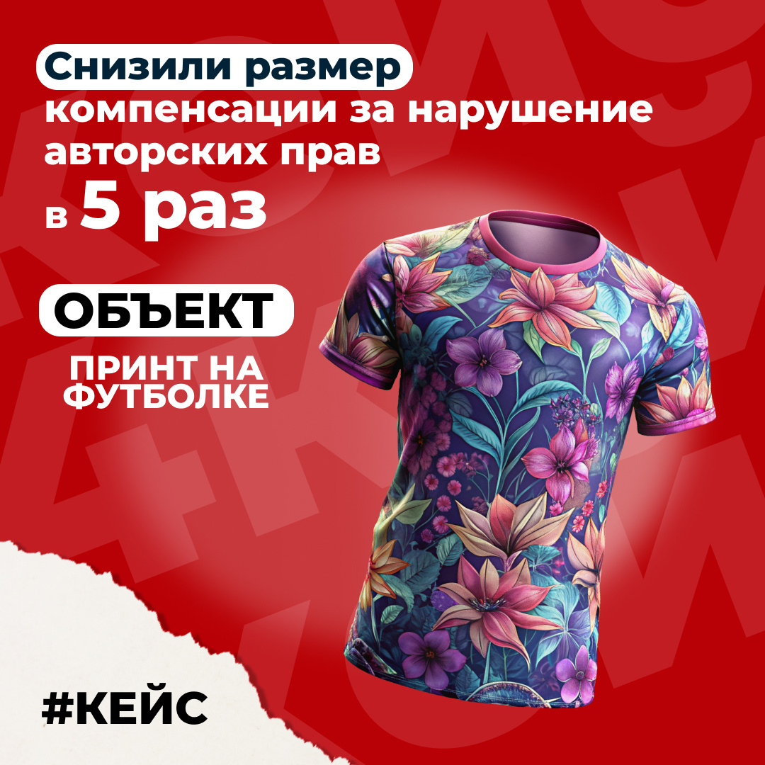 Доверитель получил иск за нарушение авторских прав. Он использовал на товарах изображение без разрешения автора. Картинку просто скачали из Интернета и начали использовать, футболки с принтом продавались на маркетплейсе и в офлайн-точке🏚.