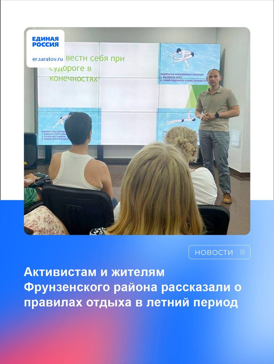✅Такие встречи повышают информированность населения о безопасности, напоминают взрослым и детям о правилах поведения на воде. 🇷🇺В Штабе общественной поддержки местный координатор партпроекта «Единой России» «Здоровое будущее», врач-травматолог СГКБ №2 Алексей Кривошеев провел лекцию для работников и родителей воспитанников детского сада «Ягодка» о правилах безопасного отдыха в летний период. 🏄🏻♂️На встрече обсудили важные аспекты здорового, активного и безопасного отдыха родителей и детей на водных объектах, предупреждение тепловых ударов и ожогов на активном солнце. А также правила оказания первой медицинской помощи при получении травм. 🗣️Участники мероприятия отметили, что такие встречи повышают информированность населения о безопасности, напоминают взрослым и детям о правилах поведения на воде в жаркий период и помогают избежать несчастных случаев.