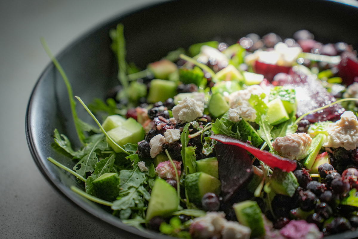 Не знаю, готовите ли вы салаты с ягодами. Но если не готовите – я здесь чтобы убедить вас попробовать. У меня ирга, но с можно с черникой или жимолостью. В моём варианте салата: рукола, свежий огурец, молодая отварная свёкла, адыгейский сыр и ягоды ирги. Заправка из оливкового масла, бальзамического уксуса и горчицы с раздавленным зубчиком чеснока. Кислинка ягод отлично вписывается здесь. Ещё люблю варианты: