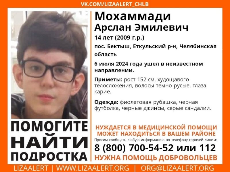 В Еткульском районе (Челябинская область) продолжаются поиски 14-летнего Арслана Мохаммади. Подростка ищут добровольцы из Челябинской, Свердловской и Тюменской областей, а также опытные поисковики из Москвы, сообщили в поисковом отряде «ЛизаАлерт». «Ночью с 7 на 8 июля на поиске работал БПЛА с тепловизором. Производился осмотр болотистой местности, отрабатывались свидетельства в городе. 125 групп отработали задачи по осмотру прилегающих территорий, опросу местных жителей и оклейке ориентировок», - рассказали в «ЛизаАлерт». Сегодня в поиске приняли участие 70 человек: волонтеры, сотрудники МЧС, полицейские, местные жители. Пока найти Арслана не удалось. Желающих помочь найти мальчика просят приезжать в добровольческий штаб в поселке Бектыш. Он открыт круглосуточно. Мальчик потерялся 6 июля в лесу рядом с поселком Бектыш, куда он приехал с родителями собирать грибы. Подросток нуждается в медицинской помощи. Мария Дмитриева