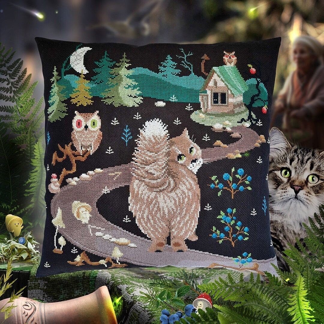 Всем большой вышивальный привет! РТО выпускает новинки. На этот раз из серии "Сказки на ночь". Мой фаворит - вот эта кошь (да, я уверена, что это кошка, не кот). Не похожа эта кошка на ведьминского кота, скорее это домашняя балованная кошка, которая сбежала из уютной квартиры и пошла искать себе приключений на то место, которое нам гордо демонстрирует)). Даже совы в шоке от такой наглости - зашла в чащу кошка - и не боится! А вон какое мрачное окружение-то - совы, поганки и вообще черепушка какая-то на дороге валяется. Но кошке все нипочем! Ощущение, что своим томным взглядом она и нас заманивает в чащобу. За ней прямо хочется пойти, чтобы хотя бы погладить. Вот так и попадают в печку доверчивые путники и варятся в супах, и пекутся у Бабки Ёжки из них пироги, а черепушки украшают заборы и дороги.. На подушке этот сюжет смотрится здорово. Обалдевшая от наглости кошачьей сова выведена отдельным набором - арт. №СХ436 "Волшебная ночь". Тут она, правда, в другом месте, но глаза продолжаю
