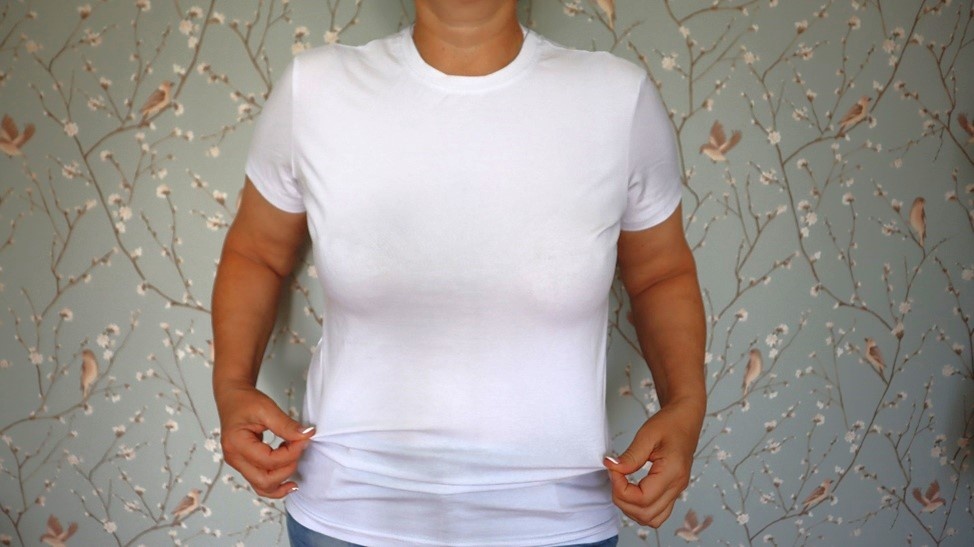 Из-за изменения фигуры некоторые вещи становятся не по размеру. Например, футболка, к которой прежде не было претензий, стала обтягивать фигуру в районе груди, живота и бедер. Это не повод списывать ее со счетов. У меня немного по-другому. Купила белую майку без примерки, на глаз посмотрела, как бы мой размер, но когда померила дома, оказалось, что она маловата, носить можно, но сильно обтягивает. Не стоит из-за этого расстраиваться, все можно исправить и увеличить размер. Естественно, надо добавить вставки и для этого понадобится другой материал. Есть разные способы, как это сделать, можно посмотреть разные варианты в интернете. Но я создала свой эксклюзивный фасон по ходу дела. Для вставок приготовила куски белой прошвы, которые остались от другой работы. Покрутила, повертела, приложила, не зная, что с ними делать. Сначала хотела сделать вставки сзади, потом по бокам. В результате решила, что красивая ткань должна быть спереди. Поэтому разрезала футболку строго посередине. С этой це