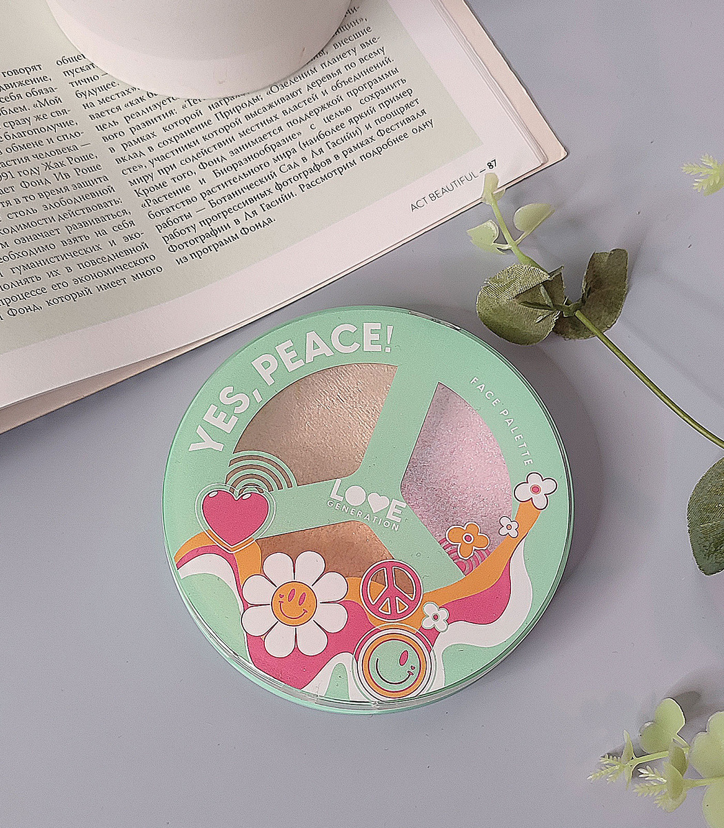 Привет, друзья. Да, я тот самый странный человек, который покупает хайлайтер, чтобы НЕ использовать его по назначению ))) Ну, потому что, именно как хайлайтер, мне данный продукт совсем не нравится, а вот как тени - супер! Речь про палетку с хайлайтерами от LOVE GENERATION Yes, Peace! Под номером 4. Если быть совсем откровенной с вами, то данная покупка совершена ради одного оттенка из палетки ))) Обозначила его стрелочкой. Он красиво переливается, смесь розового и лаванды. Частички не крупные, но и не очень мелкие, как раз идеальны для создания мерцающего эффекта. Остальные два оттенка мне не понравились, золотой слишком желтый, а персиковый крупноват, сложно набирается, короче говоря совершенно ничем не примечательны. Лавандовый оттенок меня в себя влюбил, использую сейчас его почти каждый день, добавляю в свой ежедневный макияж, как сияющий акцент. Получается очень здорово. Вот так, к примеру, выглядит один из вариантов моего повседневного макияжа. Легкая бежево-розовая дымка на гла