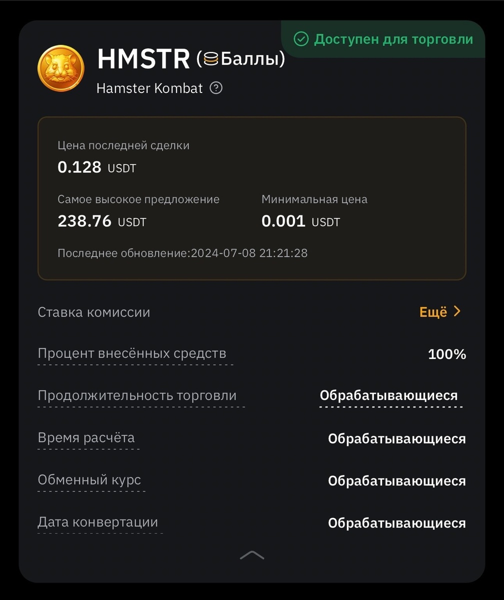 - Представители ByBit сообщили, что в будущем общее предложение будет равно 10 млрд $HMSTR. Торговля будет производится не токенами, а баллами (Points). По заявлению ByBit, «после установления официального обменного курса» баллы будут конвертироваться в ордера на токены.