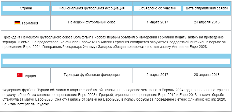 Подать заявку можно было до 3 марта 2017 года включительно. Своё желание принять Евро-2024 в итоге изъявили только Турция и Германия. Выборы страны-организатора Евро-2024 прошли 27 сентября 2018 года. В голосовании участвовали 17 членов исполнительного комитета УЕФА из 20. Германия победила благодаря простому большинству (12 голосов), Турция получила 4 голоса, ещё один член исполнительного комитета воздержался.